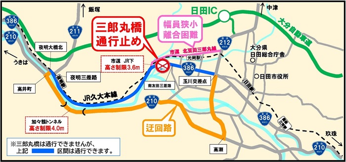 【注意】2024年7月1日の大雨の影響で、大分県日田市の国道386号線の花月川に架かる三郎丸橋が傾き通行止めになっております。迂回路が、日田市ホームページに掲載がありますので、ご確認ください。
